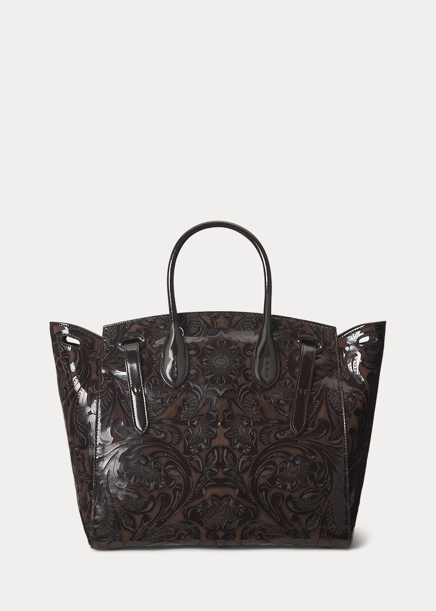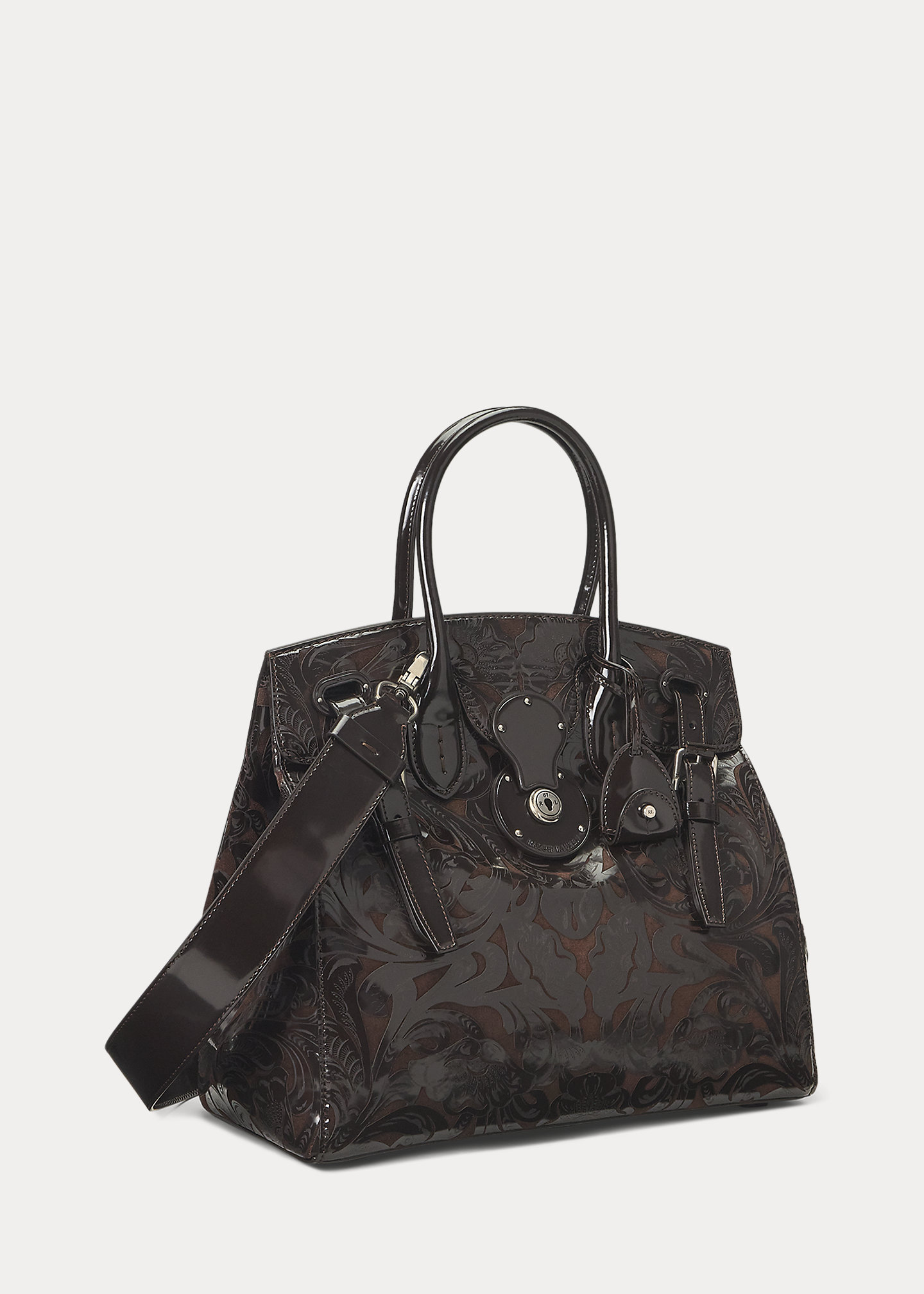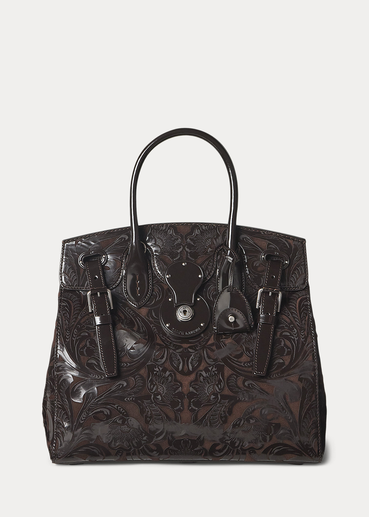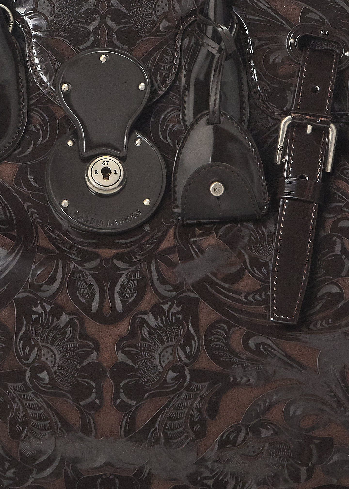 - Front flap secures with a calfskin-covered Ricky lock debossed with “Ralph Lauren.” Two calfskin straps loop through the front and secure with antiqued silver-tone buckles. Two attached keys in a removable calfskin key bell.