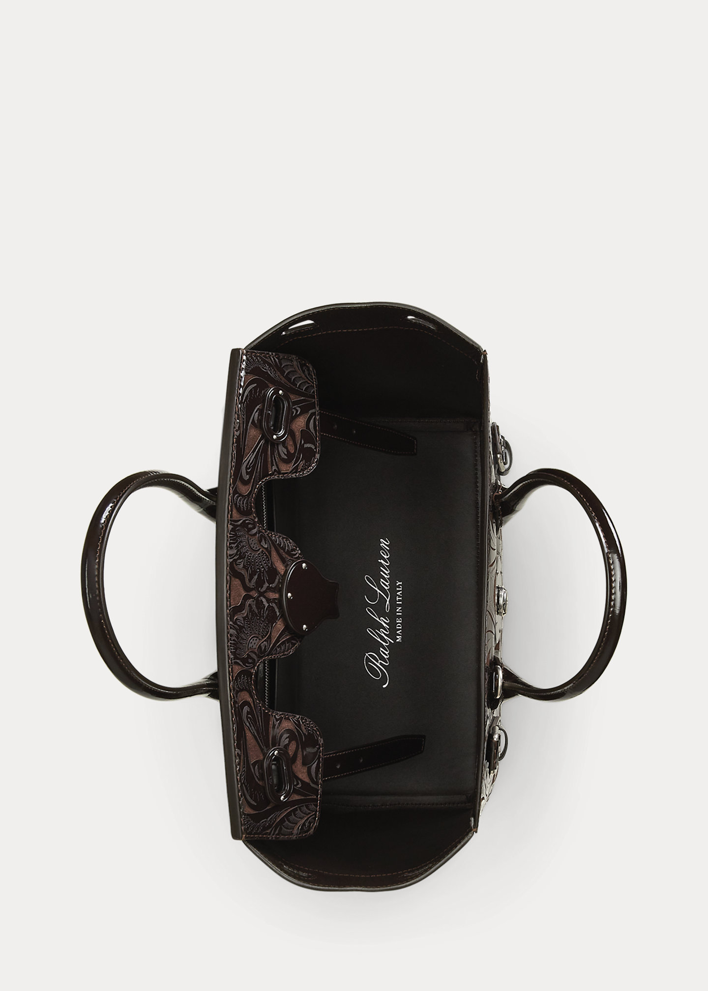 - Lined with lambskin. “Ralph Lauren Made in Italy” foil-printed at the bottom interior of the bag. Interior zip pocket with one slip compartment. Interior plaque engraved with “Ralph Lauren Made in Italy.”