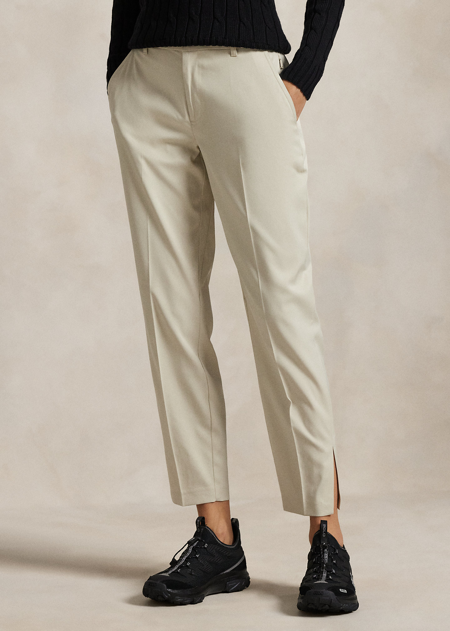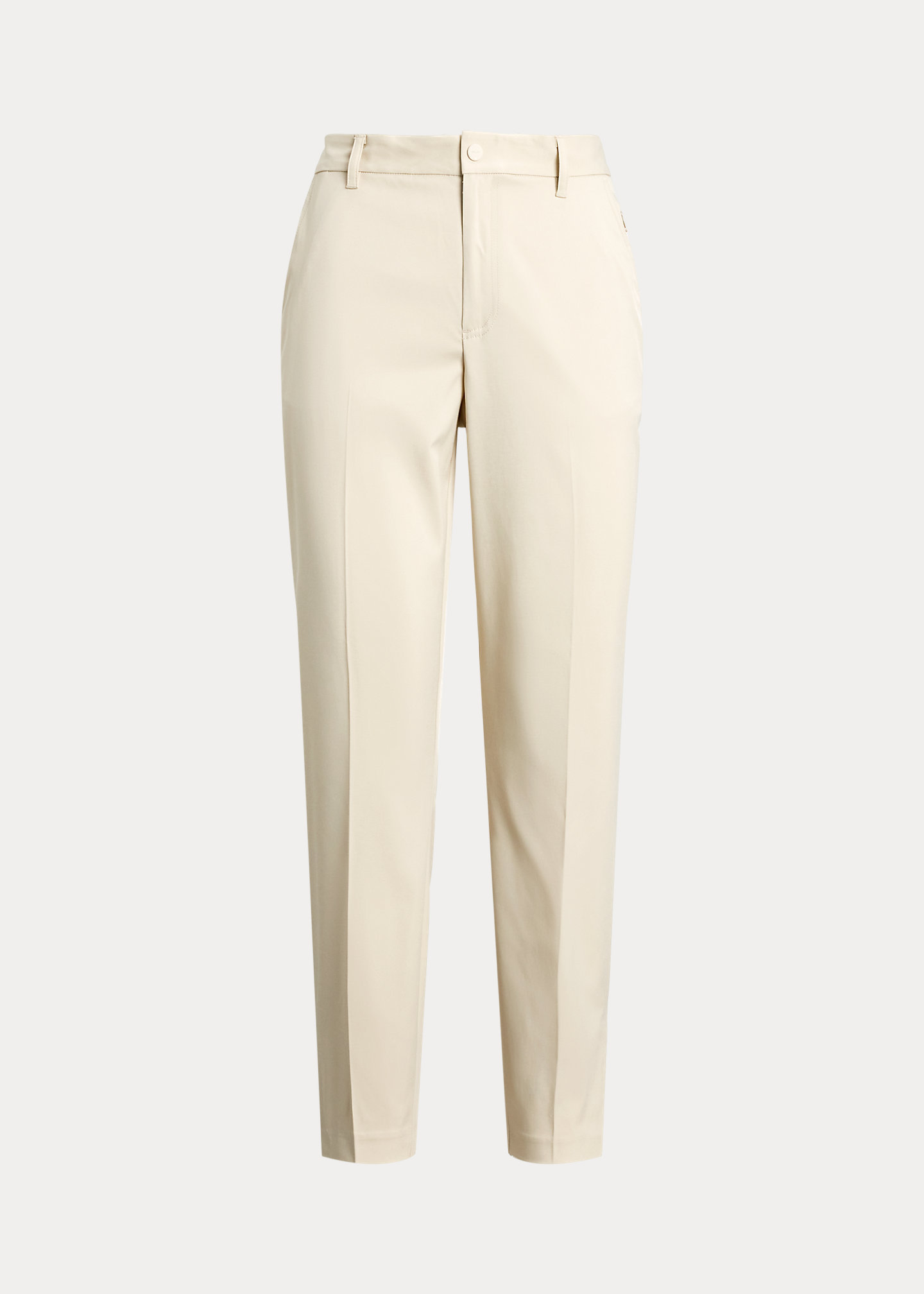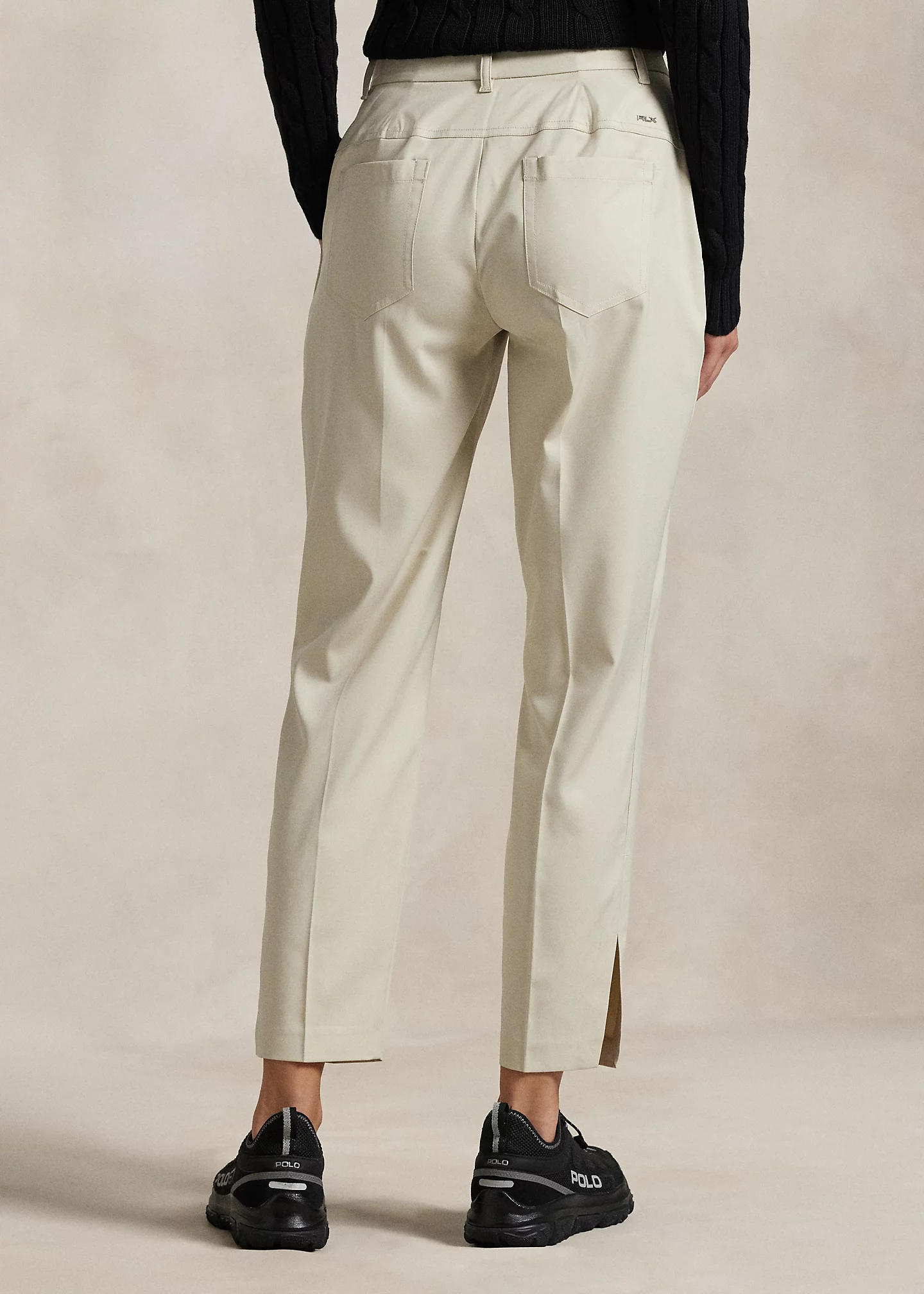 - “RLX” metal pin at the back right. Back waist darts. Creases along the front of each leg. Vents at the outer hems.