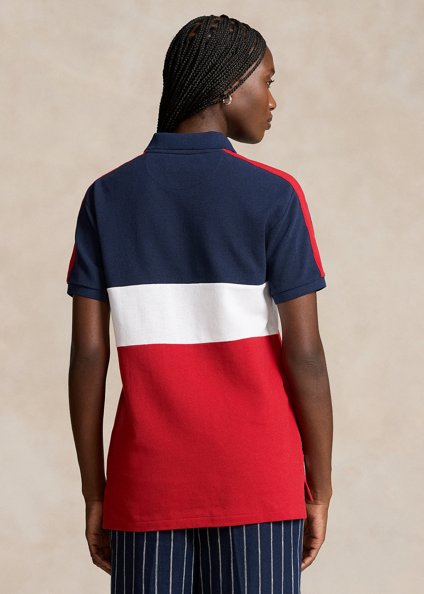 - Ribbed Polo collar. Two-button placket. Short striped sleeves with ribbed armbands. Official logo patch of the U.S. Olympic Team at the right chest. Tennis tail. "NFW Natural Fiber Welding 100% Recycled Cotton" printed at the right hem.