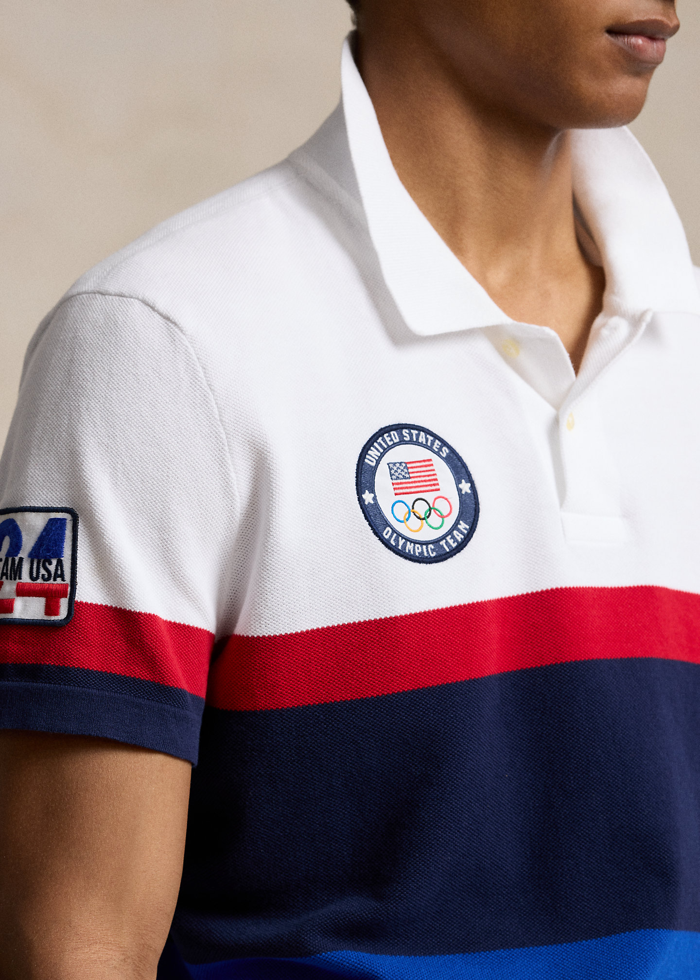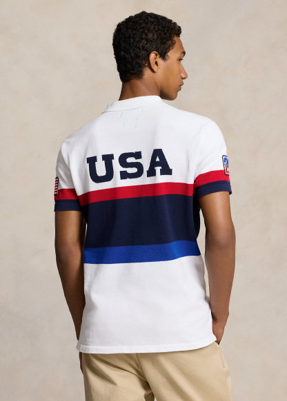 - Rib-knit Polo collar. Two-button placket. Short sleeves. American flag patch at the left sleeve. "Team USA 24" patch at the right sleeve.