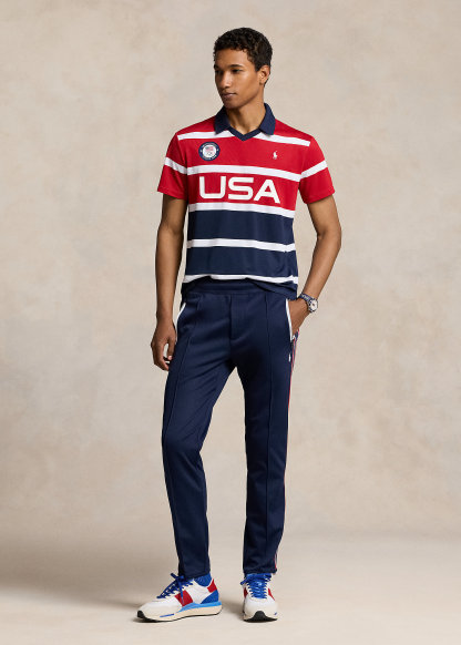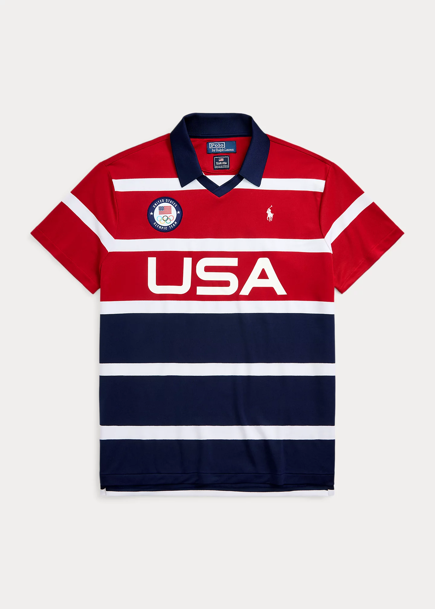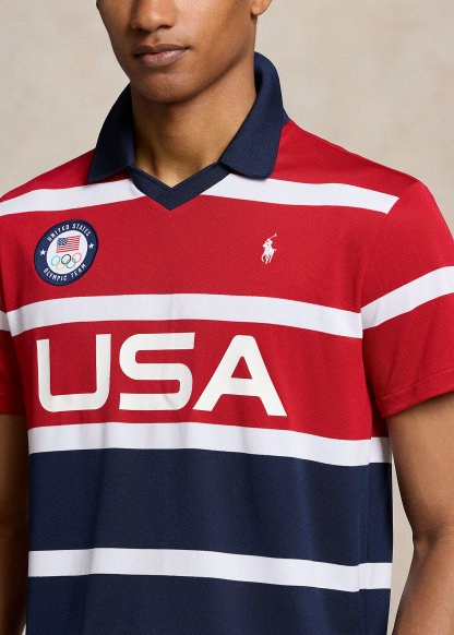 - Ribbed Johnny collar. Short sleeves. Official logo patch of the U.S. Olympic Team at the right chest. "USA" printed at the center front. Even vented hem.