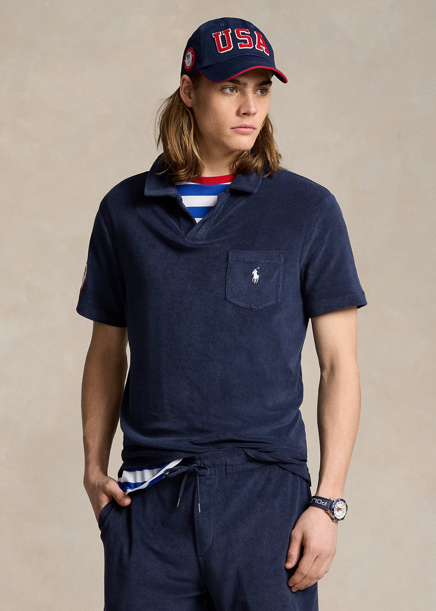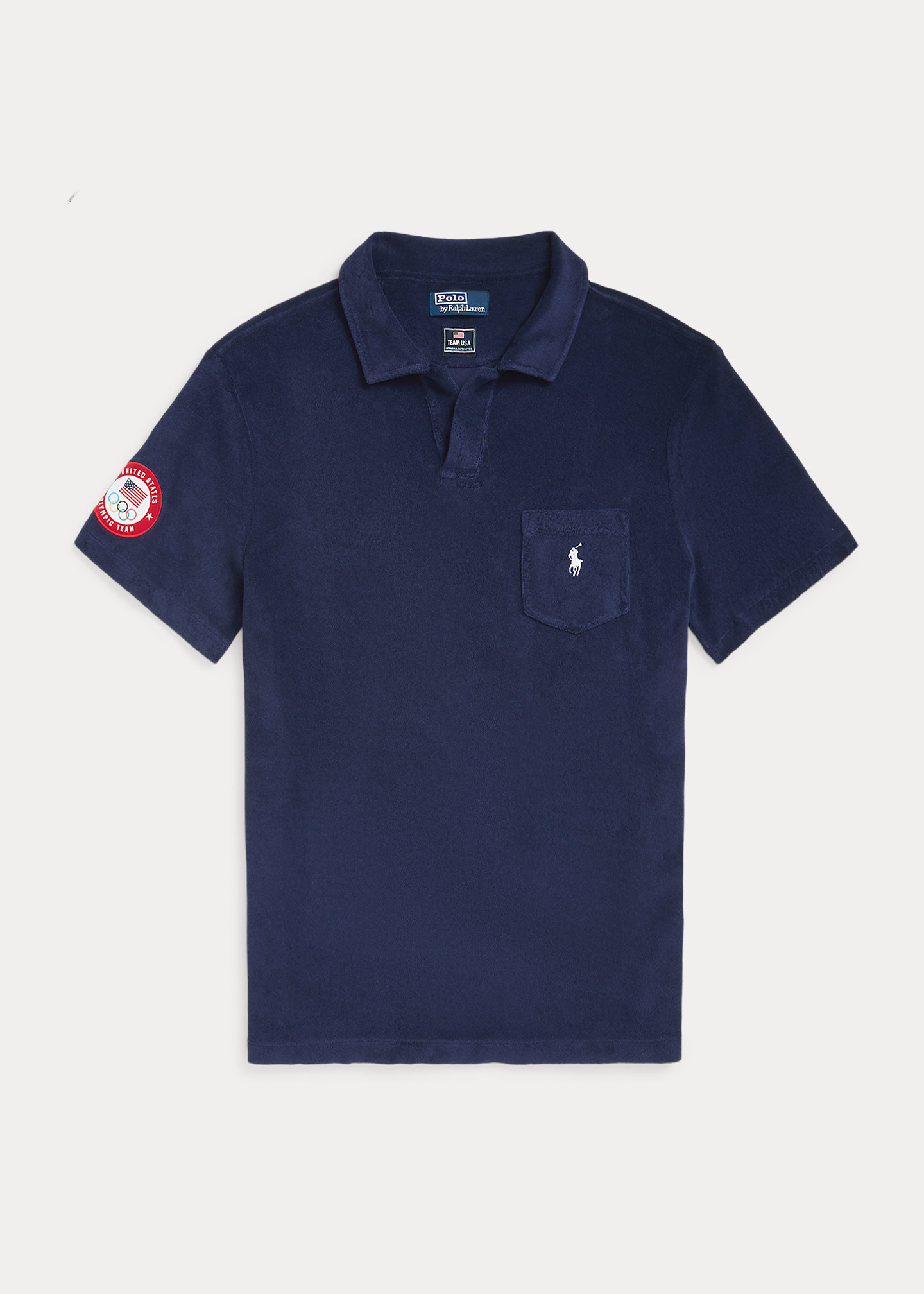 - Johnny collar. Short sleeves. Official logo patch of the U.S. Olympic Team at the right sleeve. Left chest patch pocket. Even vented hem. Signature embroidered Pony at the pocket.