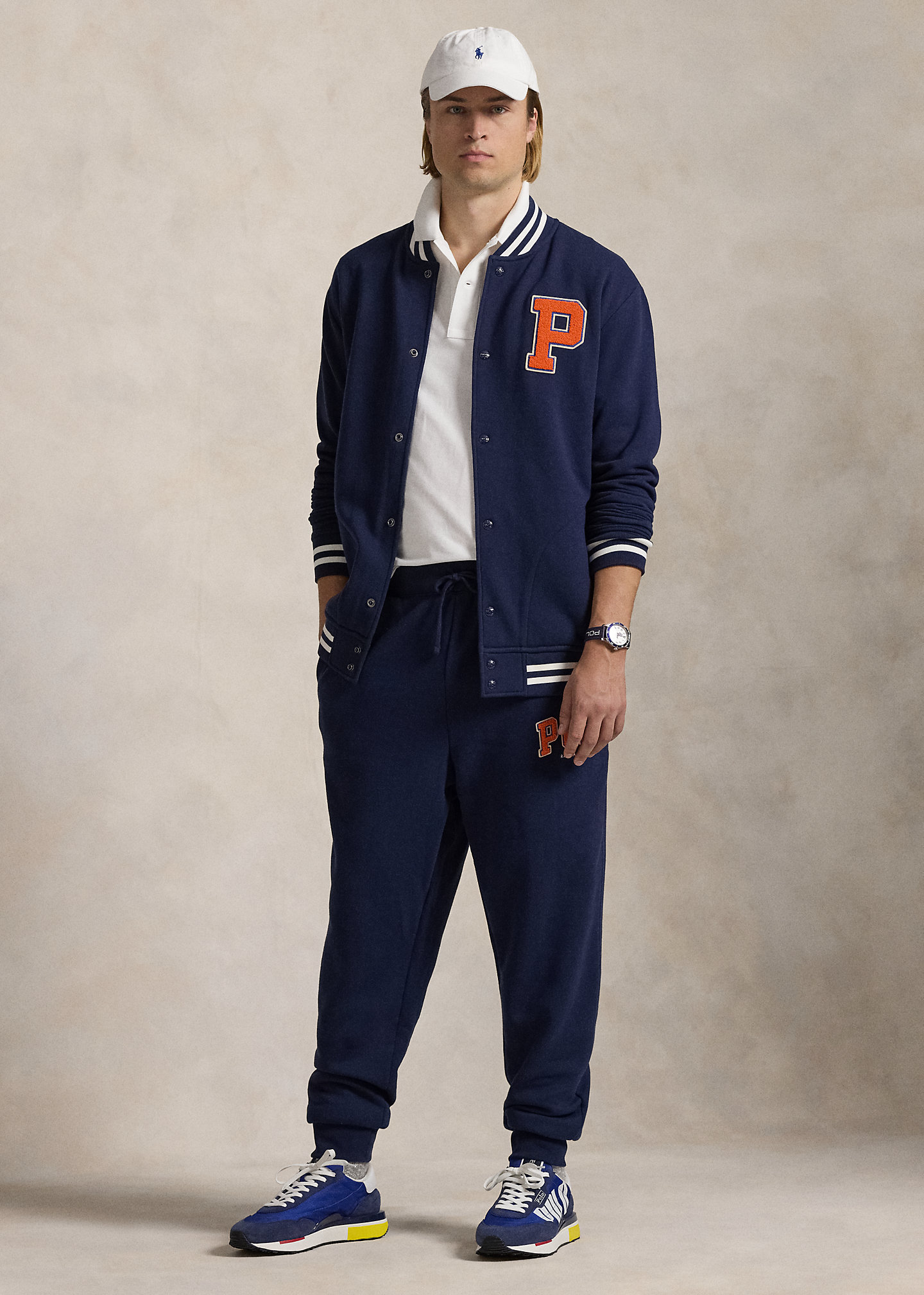- Chenille “P” patch at the left chest. Chenille patches spelling out “Polo” and chain-stitched “Ralph Lauren” embroidery at the center back.