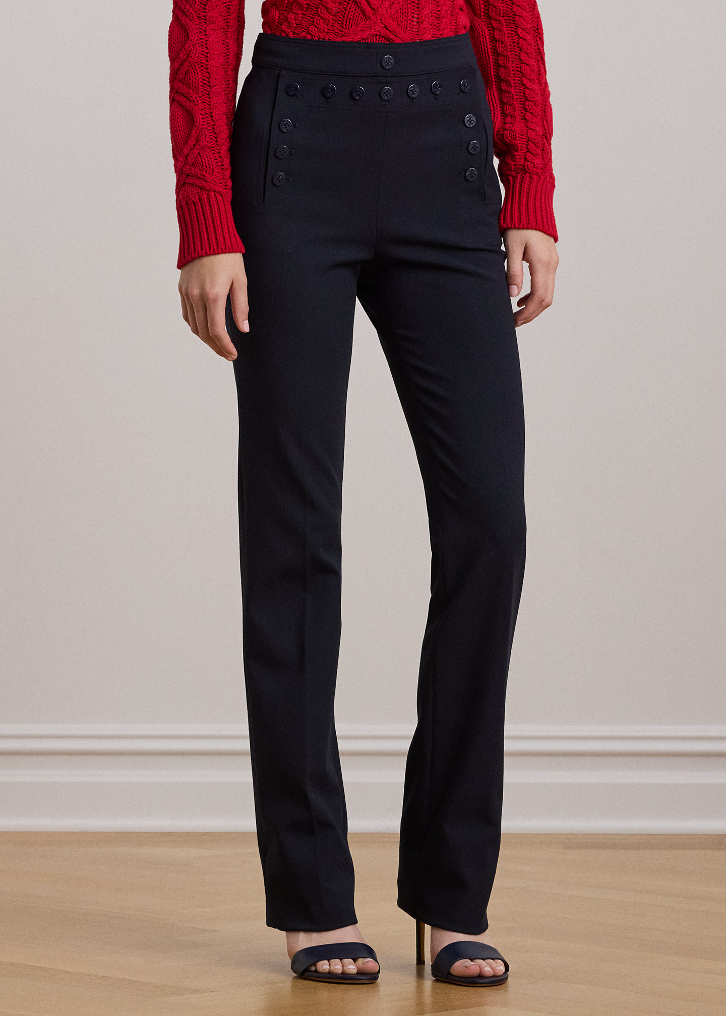 - High rise. Straight-leg silhouette. Intended to hit below the ankle.