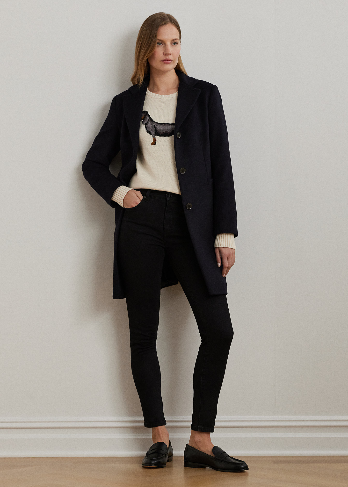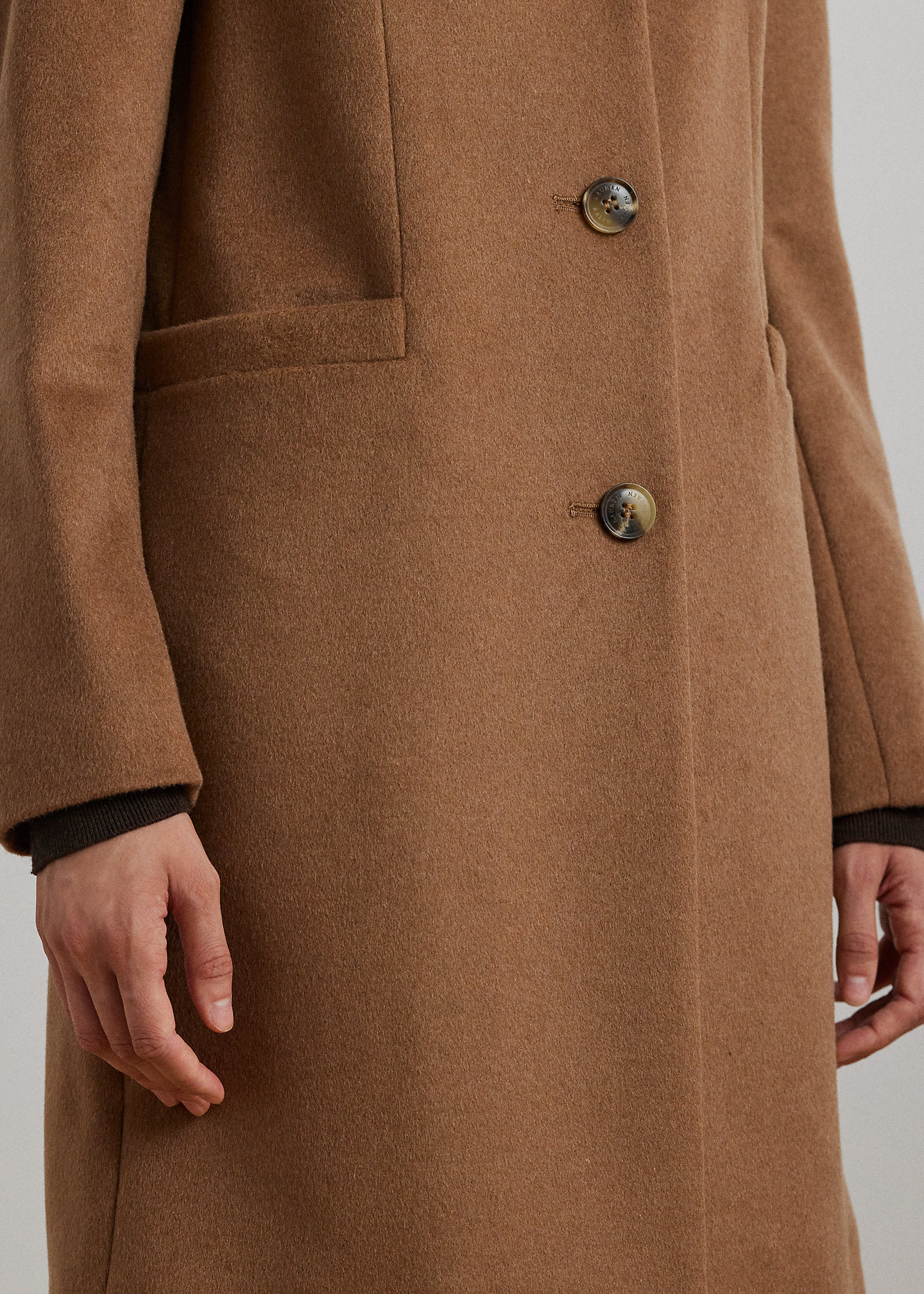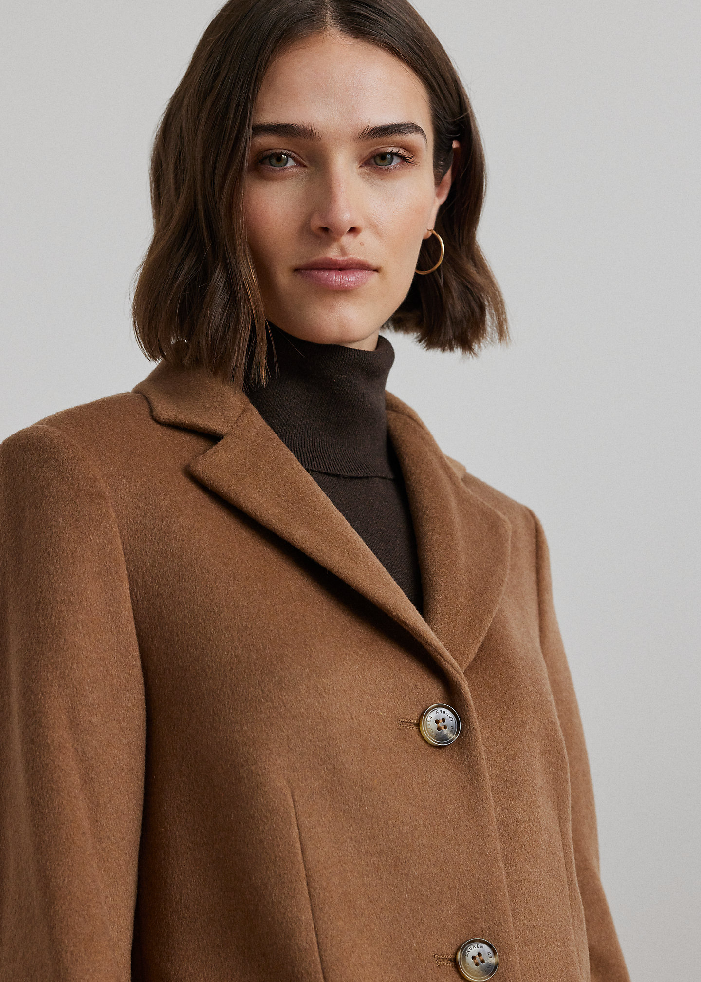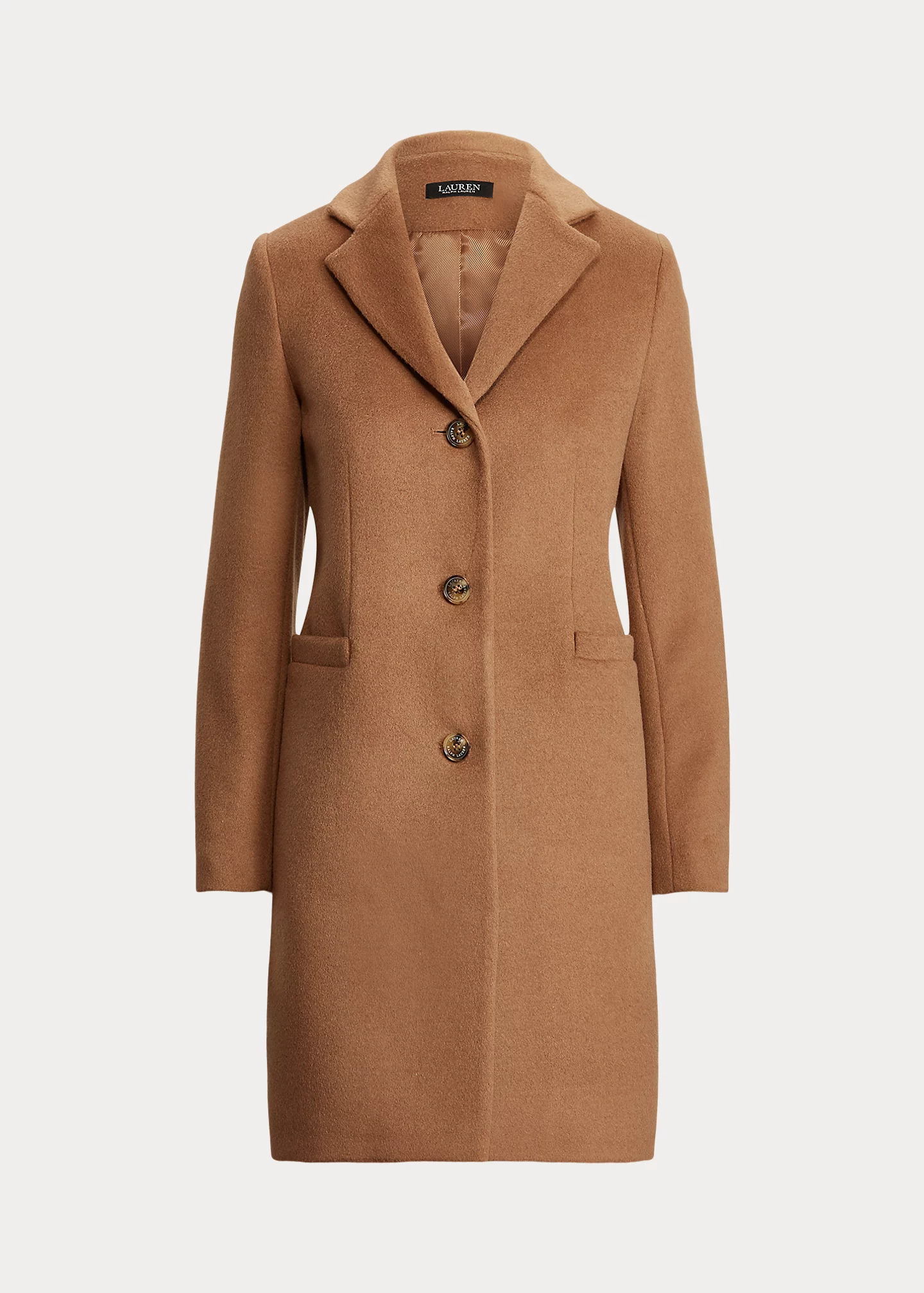 - Notch lapels. Three-button silhouette. “Lauren Ralph Lauren”–engraved horn-effect buttons.