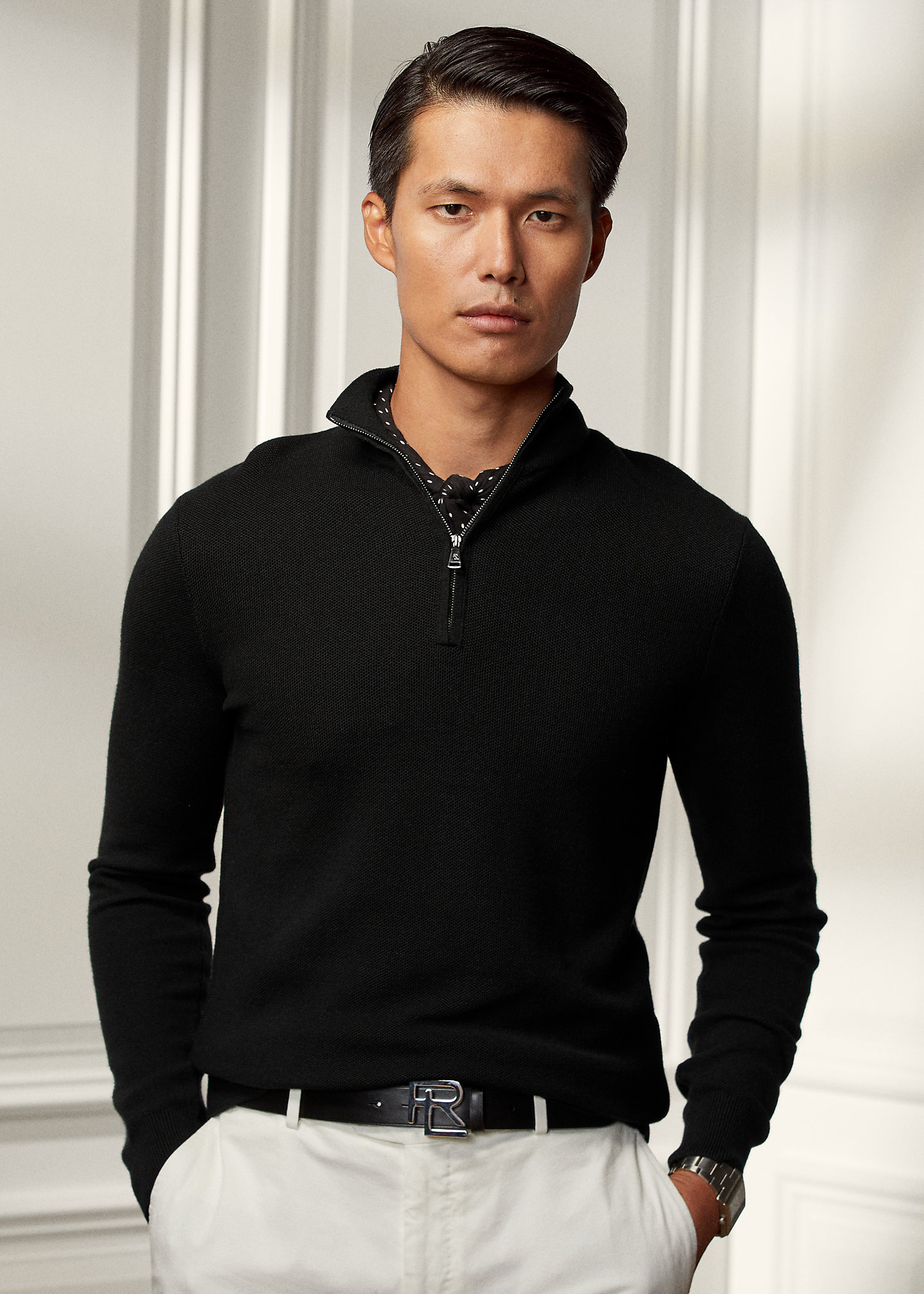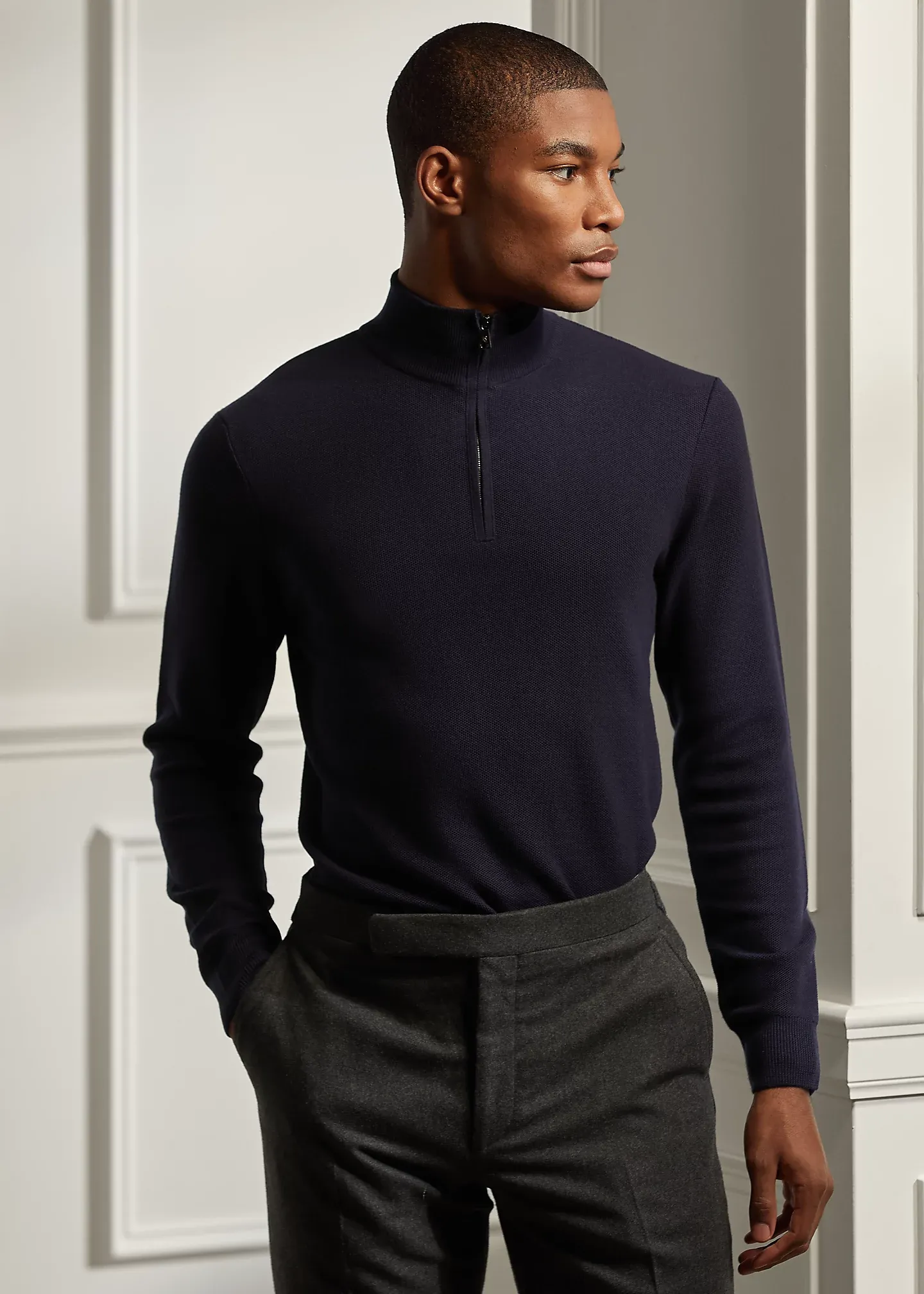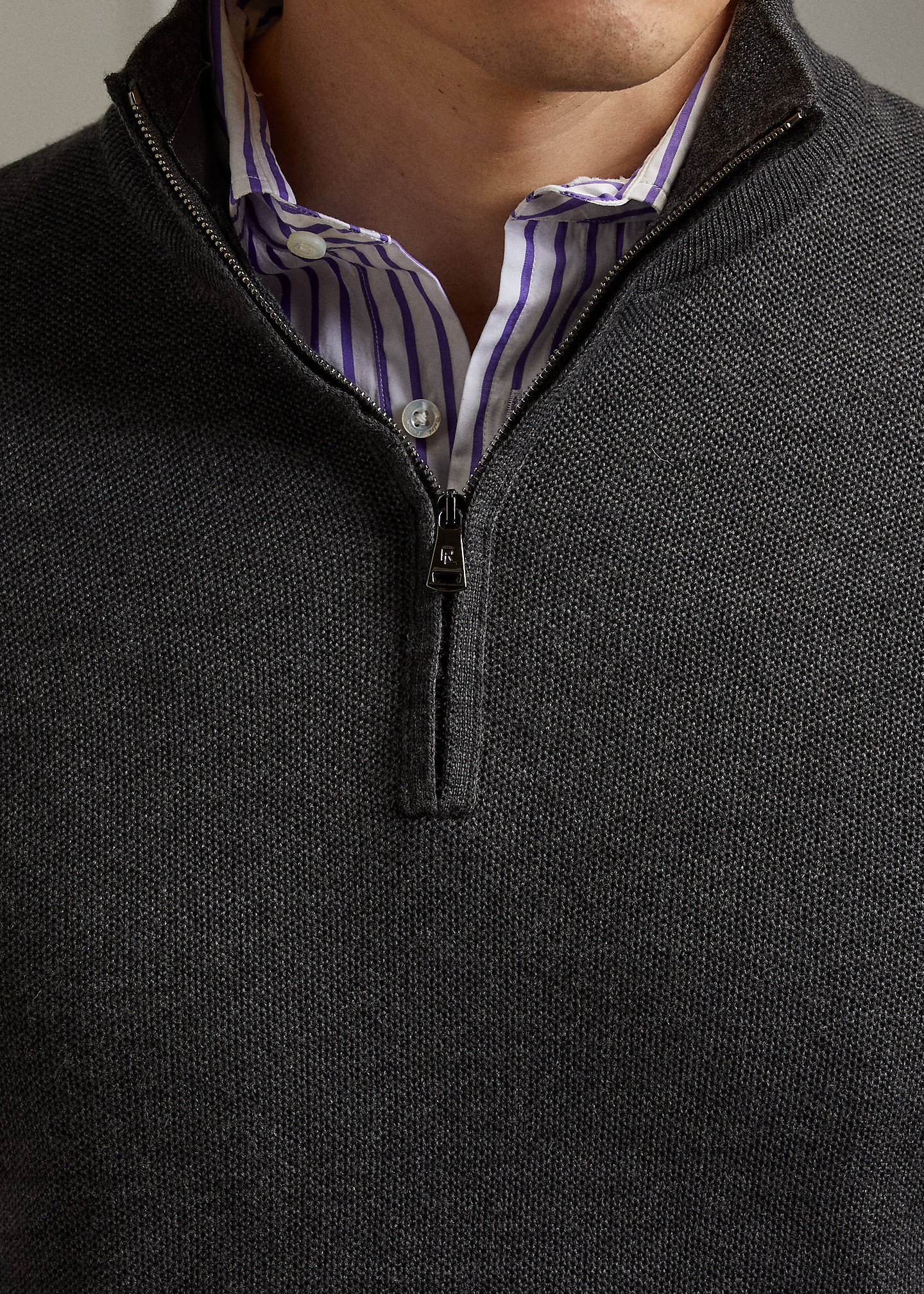- Rib-knit mockneck. Quarter-zip placket.